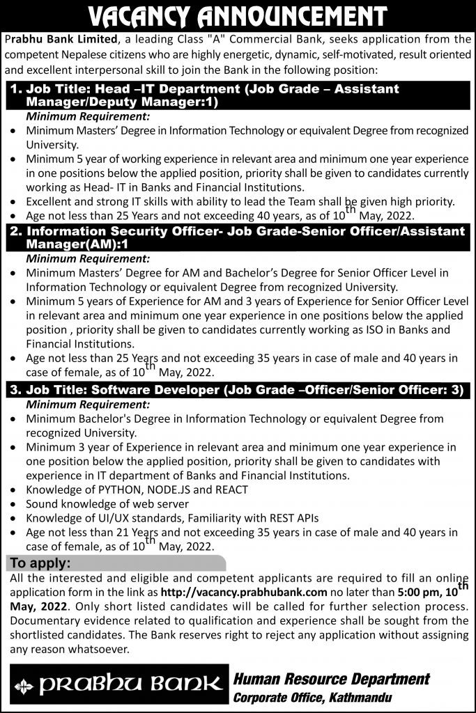 Prabhu Bank Limited (PRVU) is a leading “A” class commercial bank in Nepal. There is a Job Vacancy in Prabhu Bank.